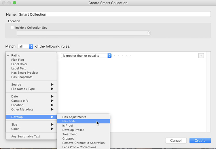 I’m basing my vote on comments, emails, Tweets, etc., because I’m seeing a lot of folks scratching their head over this one. So, Adobe added (in the recent 7.2 update) a new criteria for making Smart Collections, or filtering in the Library Filter Bar. This new criteria is called “Has Edits” so theoretically choosing this criteria would make a Smart Collection (or you can filter by it), with nothing but your images that have edits applied. But wait, isn’t there already a criteria called “Has Adjustments?” Isn’t that the same thing? Well, yes it is, but with one small, weird, confusing exception (well, confusing if you didn’t somehow know).