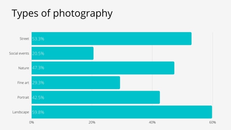 The community seems to love shooting outdoors! Street, landscape, and nature photography made up the top three types of photography that people enjoy most. It is also worth noting that architecture photography was the most frequent field added by respondents.