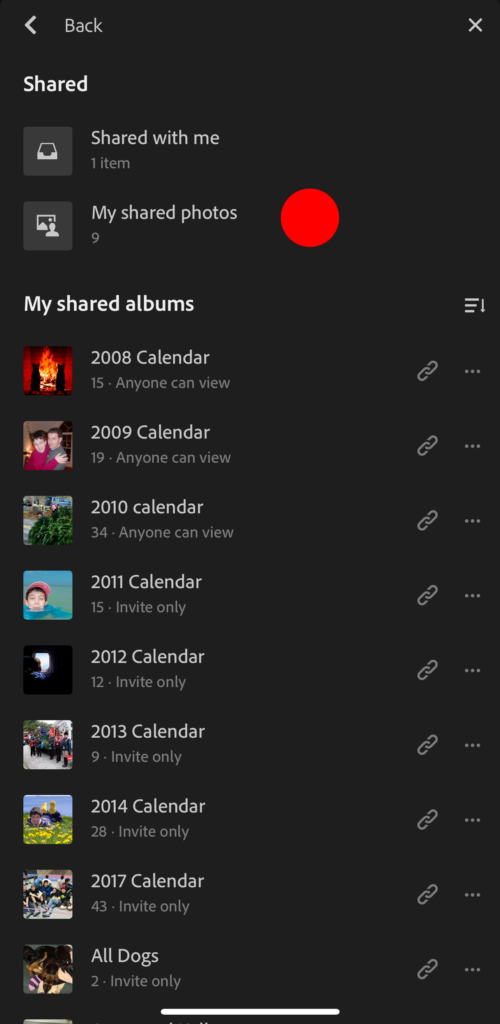 This put it right back where it was when I started this little adventure, and now I was able to do what I originally intended, though now I learned about a menu option I had never heard of or needed. My best guess is that it is for folks who want to share an album, but not have that album appear in the list under My albums on the main screen. I guess if you share a lot of albums with other people that you don’t want cluttering up this view? I just never thought of needing such an option, but now we all know in case you need it or you make the same mistake I did.