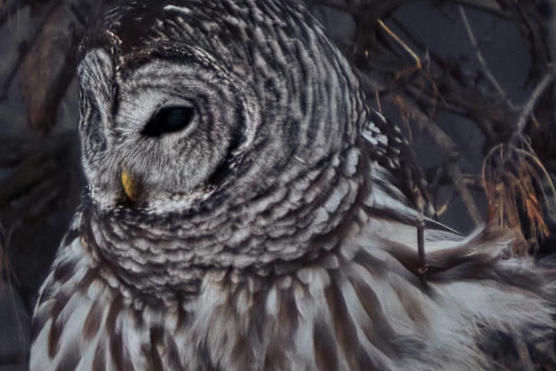 When I posted the edited image of this to Instagram, it was the same story of 1,080 pixels wide with a 100 percent crop. With the branch poking into the body, I wanted to remove that from the frame and choose a tight crop on the head in order to salvage something out of this dark, dramatic scene.