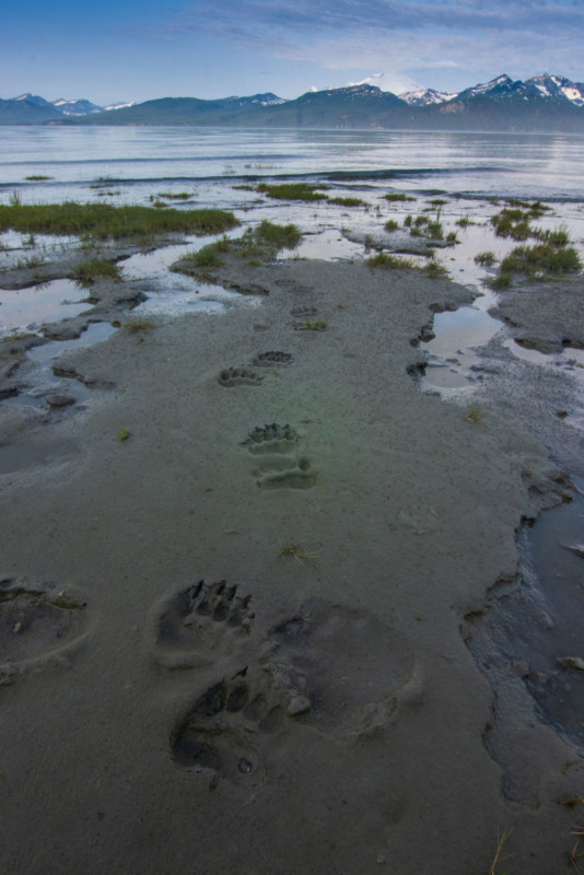 Down the beach from where we camp is home to a large concentration of bears. Soon we gather up and head in search of the mammals. As we walk the black sand beach that’s littered with volcanic erratics comprised of pumice and chunks of granite, a broad mudflat extends away to the south. It’s low tide and when the water retreats, thick mudflats are comprised of finely-silted soil from eons of the grinding action of upstream glaciers. Every six hours or so, the water levels wax or wane depending on the position of the moon relative to the earth. When the water comes in, it comes in fast and the tides are immense. While we are here, twenty-foot tides are the norm.
