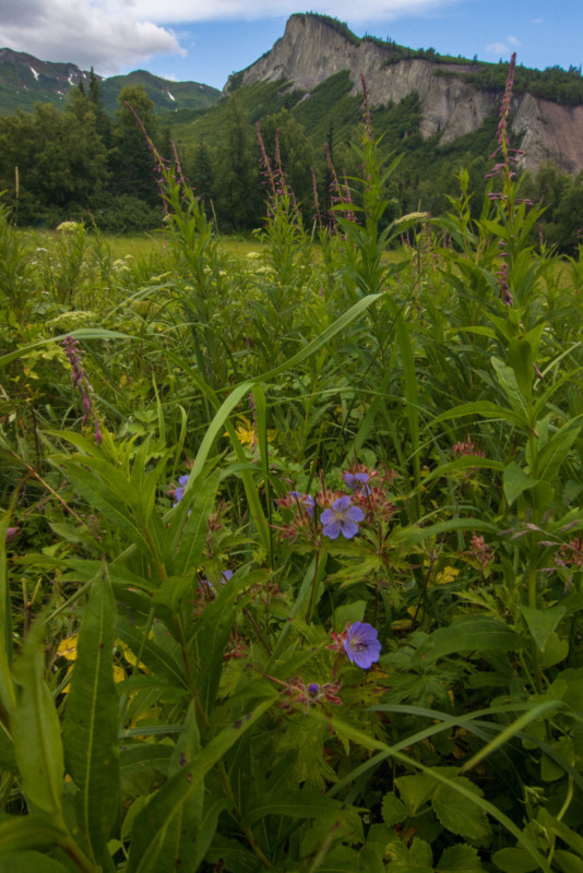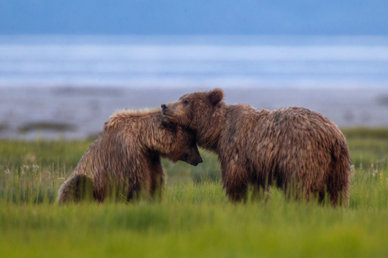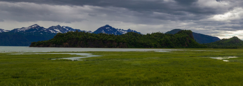 Sedges are a group of grasses that grow in moist soil areas. Thin and low growing, the cilantro-smelling plants are a favorite of omnivorous brown bears who supplement their diet of clams and carrion with the easily obtained vegetation. Since the cove is periodically flooded by high tides, the ground is saturated like a sponge. From a distance, the sedge meadow is green, lush, and flat. Once in the meadow, the walking is a bit challenging because of the ever-present mud, potholes, and ditches that are carved through the landscape. Here, the modern world doesn’t seem to exist. Save for a distant airplane, the only sounds you hear is the wind, a distant waterfall cascading from the side of a mountain and cutting through a peat bog, and the occasional bawl of a baby brown bear who’s crying to their mother for food.