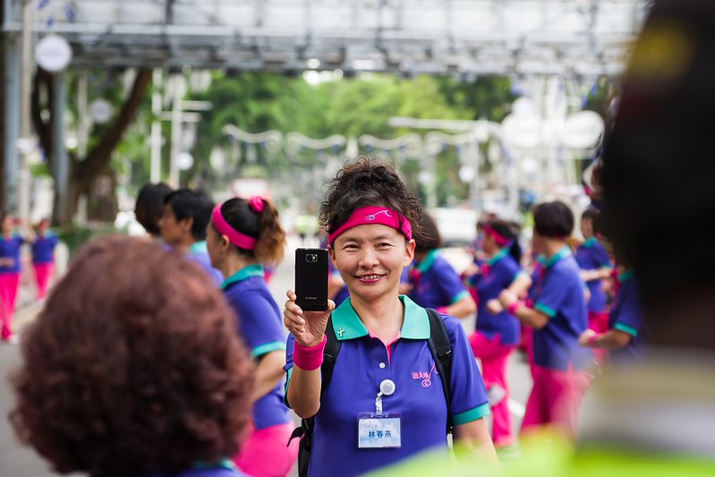 Activities on the roads of Orchard Road. The performer taking photos of people watching..