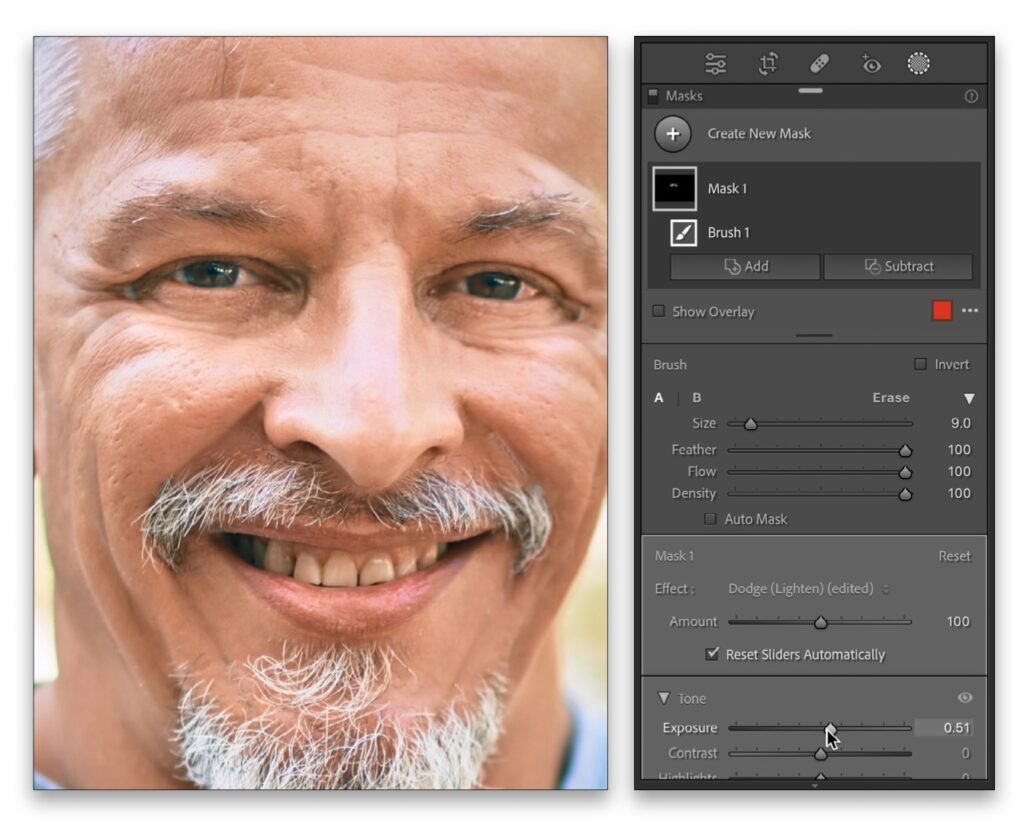 STEP 11: Make the Brush about the size of one of his eye sockets and paint over both eyes. Next, we’re going to increase the Exposure amount and dial in the right amount of brightness. You’re looking to match the brightness of those eye sockets with the rest of his face. In this case, that had me raising the Exposure slider to around +0.50, or around 1/2 a stop brighter, and that did the trick. You could probably brighten the whites (the sclera) of his eyes a bit too, which we covered last week.