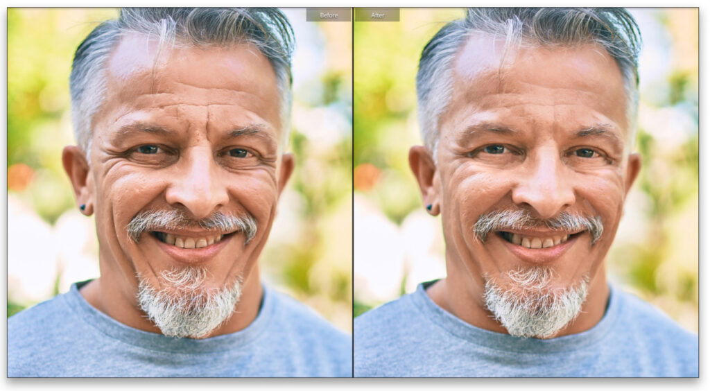 Above: Here, I changed all of them to 60%, so the wrinkles are lessened even more. You could also lower the Opacity if you want to bring back more of a wrinkle. Zooming out will help make that decision easier because you can see more of the overall face. Again, the side-by-side is a helpful view here too.