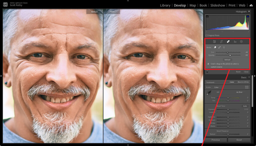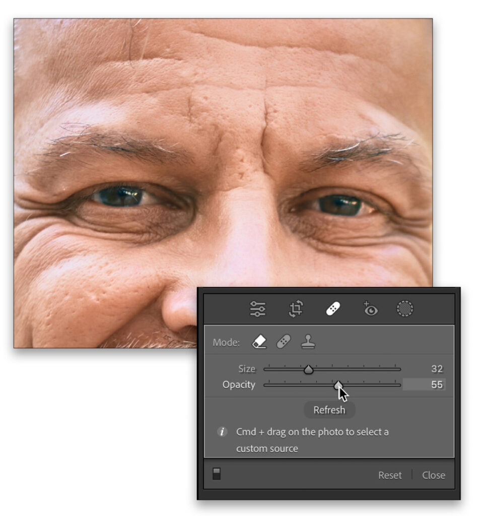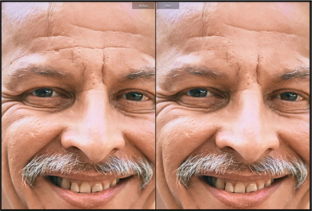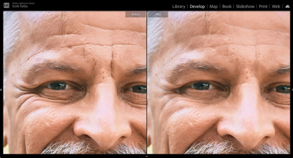 STEP EIGHT: Next, let’s do the same thing with the wrinkles under his eyes. Just paint over those areas to reduce their intensity. Have you noticed how much better a job this is doing removing these wrinkles than Lightroom used to do in the past? That’s because this erase Mode of the Healing tool is based on Photoshop’s Content-Aware technology and, in most situations, it’s vastly better than the old Spot Removal tool, which was well-named because that’s pretty much what it was good for: removing spots.