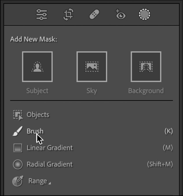 STEP 10: His eyes are a little deep set, and that makes his eye area look darker (and older), so let’s brighten that area up a little to finish things off. Up in the toolbar, click on the Masking icon (it’s the gray circle with the dotted white line around it) to bring up the list of masking tools. Click on the Brush tool (as shown above). In the brush controls, set both the Flow and Density to 100.