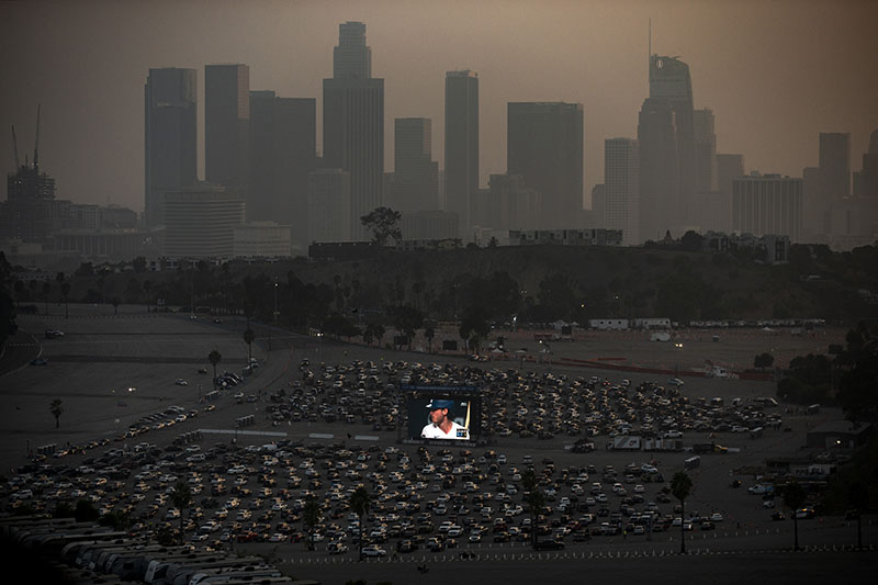 Los Angeles Dodgers’ fans watch game two of the World Series 2020 between the Tampa Bay Rays and Los Angeles Dodgers, at a drive-in organized on the grounds of Dodger Stadium (foreground) amid the coronavirus pandemic in Los Angeles, California, USA – 21 October 2020.