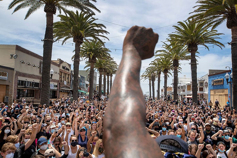 Several hundred Black Lives Matter protesters take a knee and hold their fists in the air during a moment of silence to honor George Floyd during a peaceful protest march from Manhattan Beach to Hermosa Beach and return at the Hermosa Beach Pier Plaza, Hermosa Beach, Los Angeles, California, USA – 02 Jun 2020