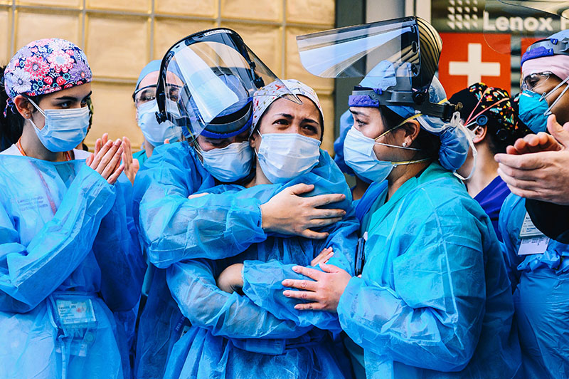 Medical workers are seen outside Lenox Health Greenwich Village as people applaud at 7 pm to show their gratitude to medical staff and essential workers on the front lines of the coronavirus pandemic, New York, USA – 28 Apr 2020