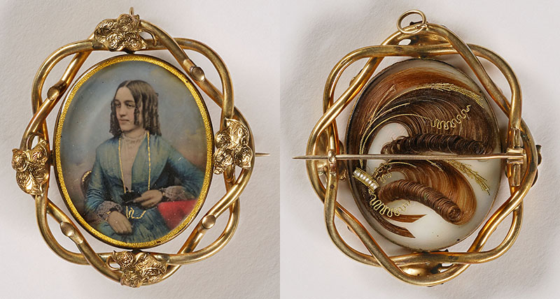 (left) Unidentified artist, Untitled (pin/pendant, woman with curls; verso, with sculpted hair), 1853, daguerreotype in a metal setting. Smithsonian American Art Museum, the L. J. West Collection of photographic Jewelry, (right) Unidentified artist, Untitled (pin/pendant, woman with curls; verso, with sculpted hair), 1853, daguerreotype in a metal setting. Smithsonian American Art Museum, the L. J. West Collection of Photographic Jewelry.