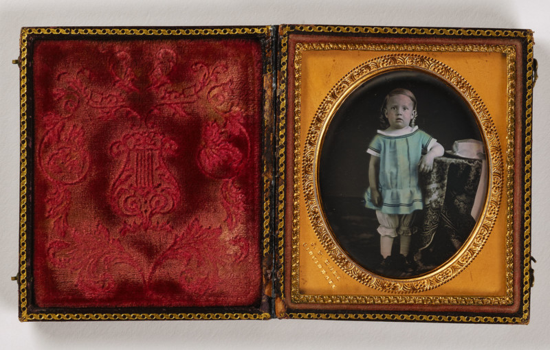 The collection includes many daguerreotypes, which was the first publicly available photographic process. It was invented by Louis Daguerre in France and introduced worldwide in 1839. The process involves polishing a sheet of silver-plated copper to a mirror finish, making it light-sensitive, and then exposing it in the camera. The latent image is next developed with mercury fumes and finally sealed in a protective case to protect it.