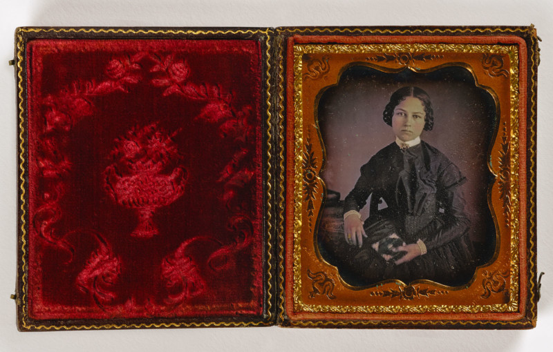 Augustus Washington, Untitled (woman with books and cased image), undated, sixth-plate daguerreotype. Smithsonian American Art Museum, the L. J. West Collection of Early African American Photography.