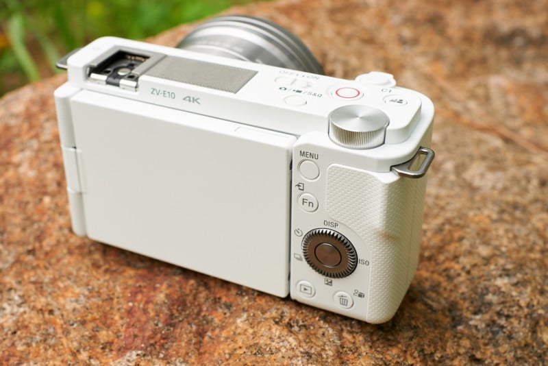 If you were tasked to design the smallest possible camera that featured an APS-C sensor, an E-mount, and an adequate grip, the ZV-E10 would be that camera. There is nothing in the form factor that is extra. It’s quite thin, barely housing a good-sized sensor before falling out the other side. The height could not possibly be made any shorter as the lens mount butts up against the top and bottom edges. While the grip is minimal, it does enough to improve handling and makes room for the shutter button and zoom control, not to mention the battery housed within. It’s immediately clear that having a compact size was one of the primary goals with this product and has an effect on everything else to fall in line.