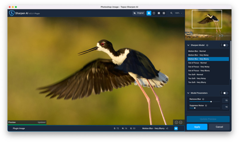 Inside Sharpen AI, the correction options are plainly laid out for simple understanding. This image has severe motion blur, so I chose the “Motion Blur – Very Blurry” sharpen model. From here, I’m able to adjust the amount of blur removal and noise suppression that is applied.