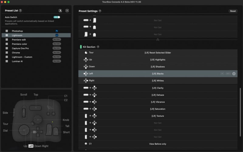 When you first open the TourBox application, it is pre-loaded with a basic configuration for applications like Photoshop, Lightroom, and Premiere Pro. Additional presets can be downloaded from the official TourBox Preset website, other users, or you can make your own. It is even possible to customize the TourBox for applications like Google Chrome for easier web browsing. Basically, the application gives users the freedom to create custom controls for almost any application on their computer including macros for multiple custom commands to be enabled with a single button click. TourBox can also automatically switch between applications that you have set up presets and actions for.