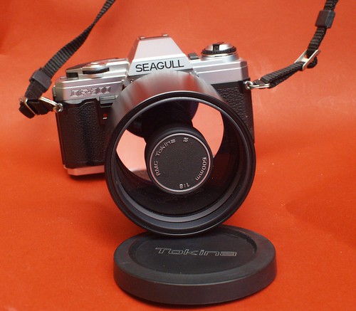 " The RMC Tokina 500mm 1:8 (or Tokina TM 500) is a tele lens with mirror optics and fixed aperture f8. It is focusable from 1.5 metres to infinity. As item of Tokina's RMC lens series it was made in variants for different lens mounts of renowned SLR makers. And it has a metal hood that is nearly as long as the lens and can be screwed upon the lens to avoid reflections. It can also be screwed reversely upon the lens so that it protects the lens barrel. The mirror optics lens may give a characteristic ring bokeh when unsharp image areas are rich of contrasts. "